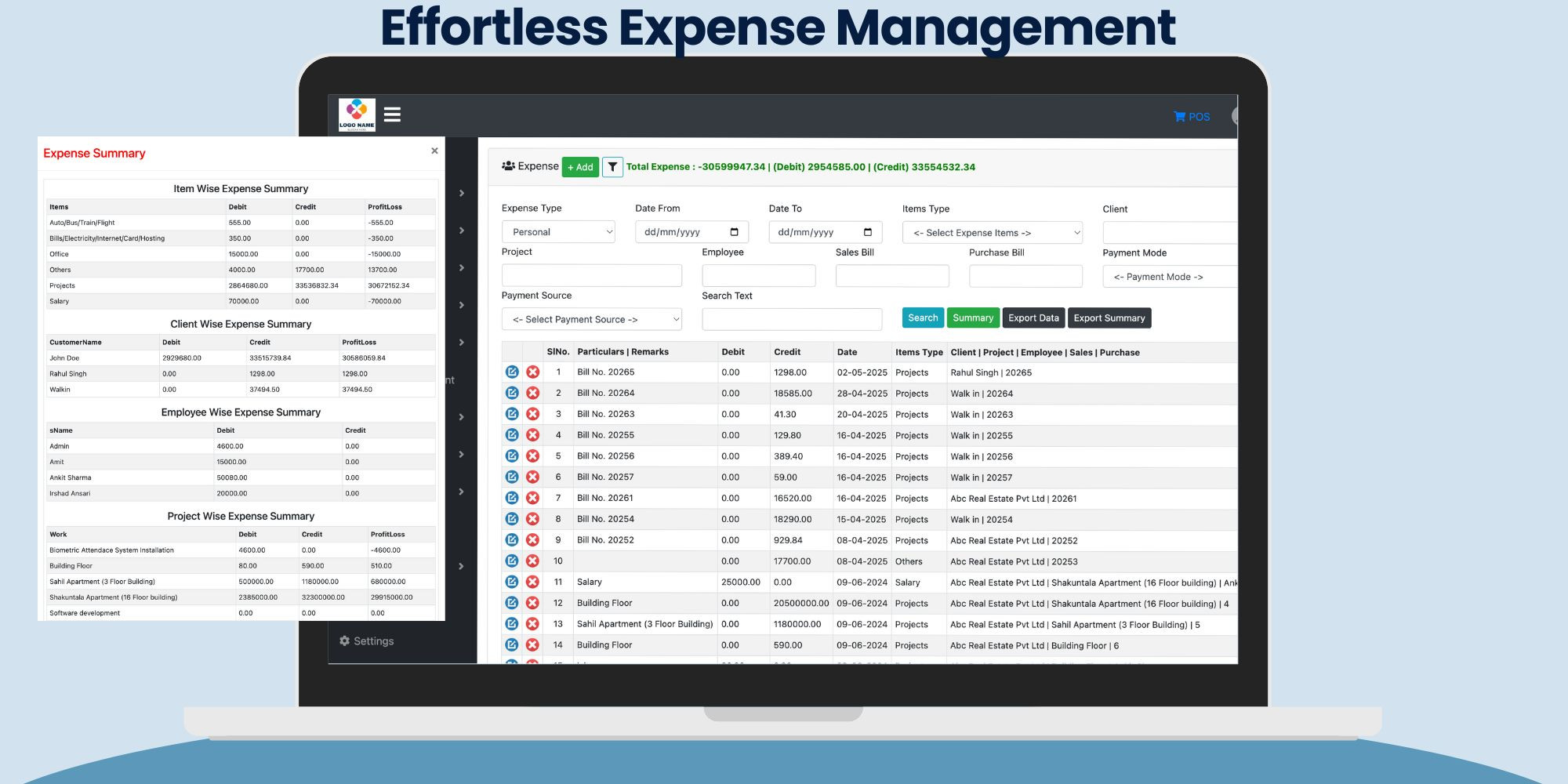 - Expense Reporting: Generate detailed expense report summary for individuals, projects, clients, or employee