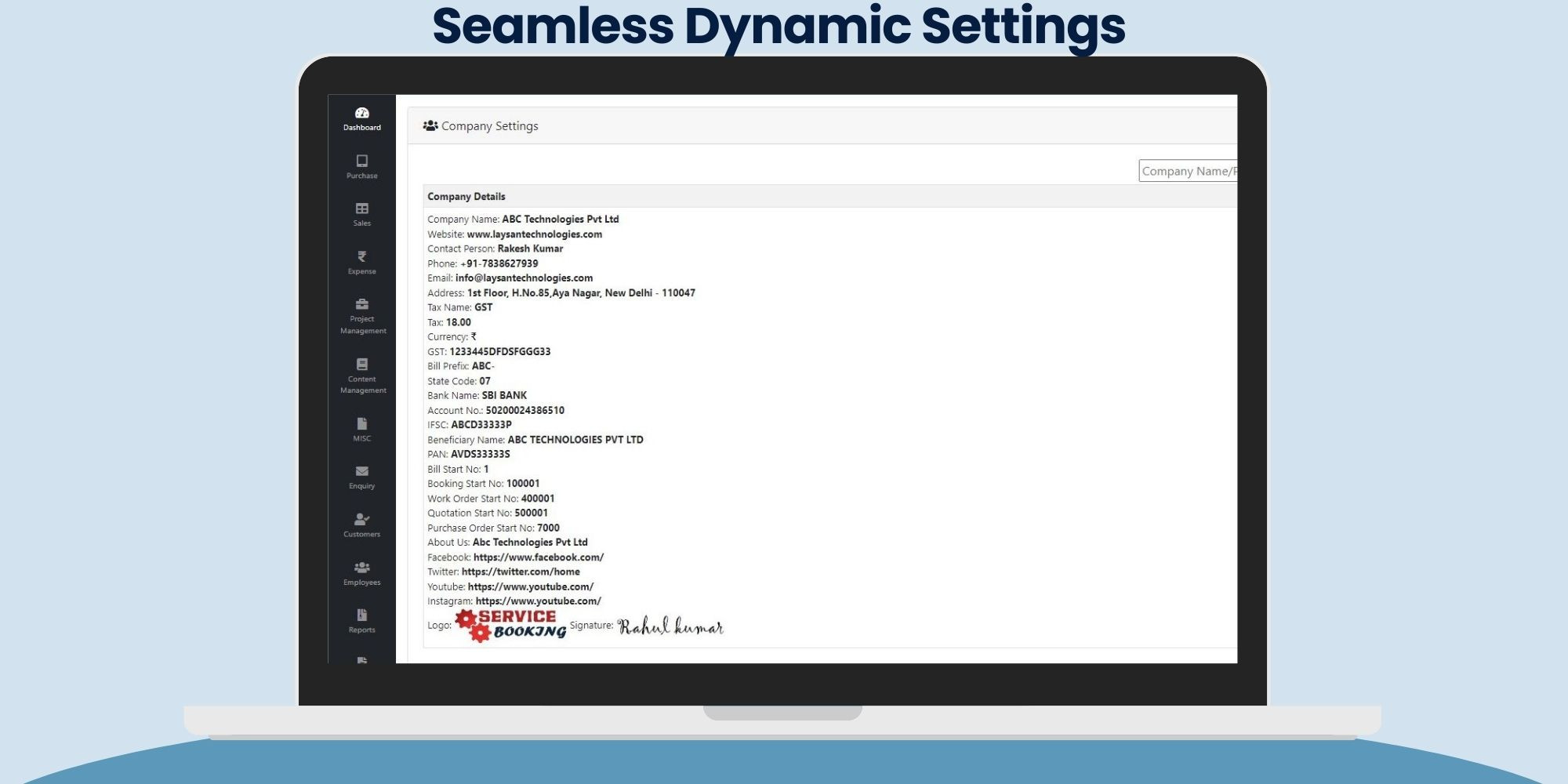- Company Settings: Set your company logo, name, gst, bill prefix etc from a single business settings.