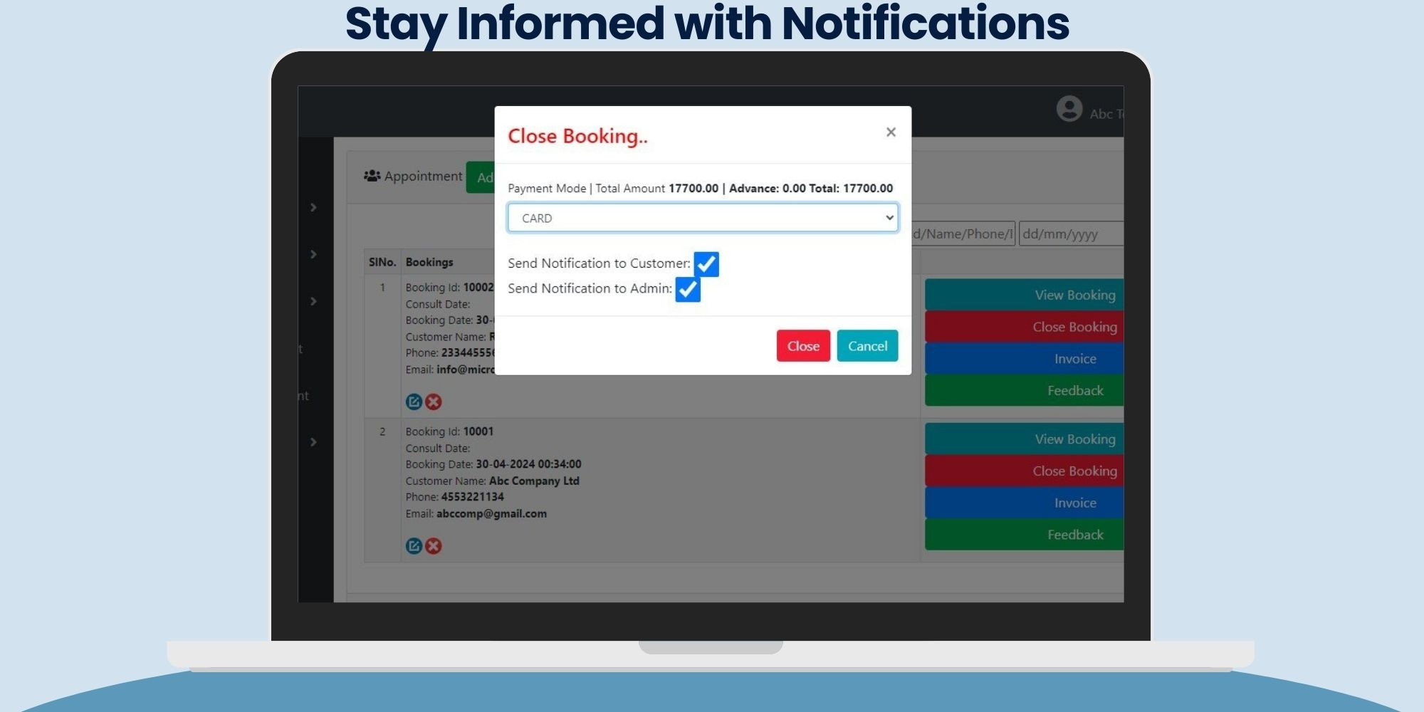 - Real-Time Notifications: Receive timely notifications for upcoming appointments, project schedule & close booking.