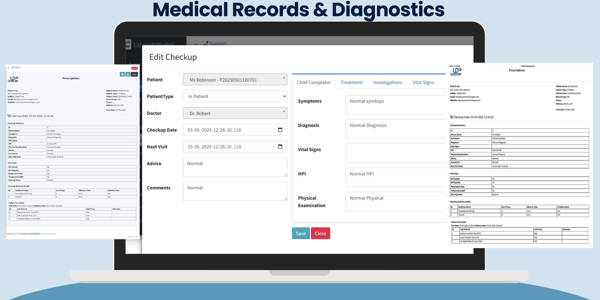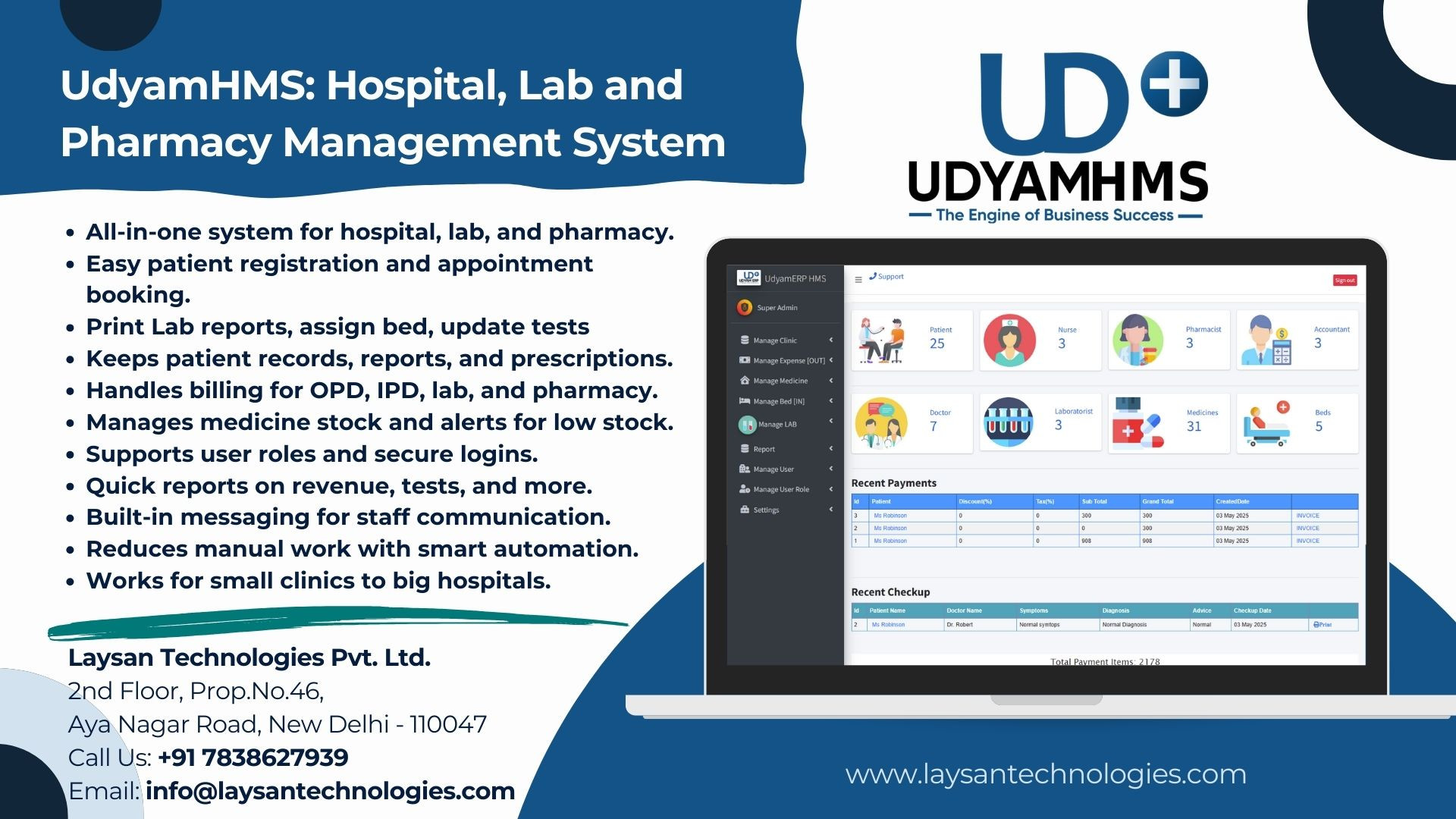 UdyamHMS is a comprehensive Hospital, Laboratory, and Pharmacy Management System built to digitize day-to-day activities and improve the overall administration of healthcare facilities. It replaces time-consuming manual tasks with automated, real-time processes — empowering medical professionals, admin staff, and decision-makers with the tools they need to work smarter.